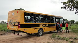 | ônibus antigo e frequente em panes que hoje está transportando os alunos |